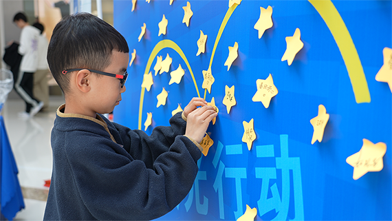活动现场,“全生涯支持”主题展板前人头攒动,展板通过图文并茂的形式,清晰展示了孤独症儿童成长过程中的关键支持节点,倡导“不因年龄增长而中断关爱”的持续陪伴理念。蓝色科普倡导打卡区成为最具人气的互动场景,市民们在星空背景板前手持“壹起抱抱”“你的一点点善意,就是他们的一束光”等主题手牌拍照留念,通过朋友圈分享爱心接力,让公益倡导从现场延伸至城市的每个角落,让更多人看见孤独症群体的需求与力量。