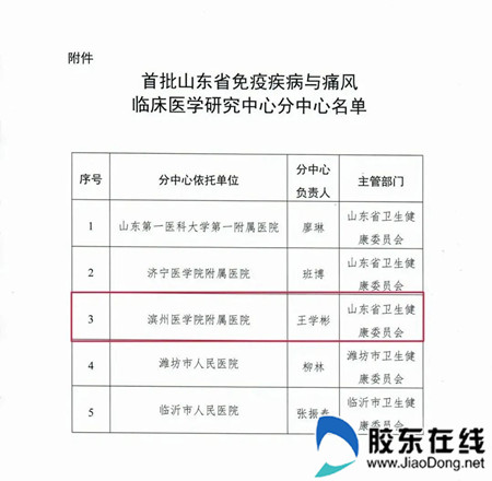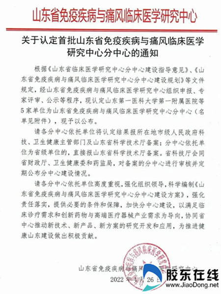 胶东在线4月29日讯 近日,根据《山东省临床医学研究中心分中心建设指导意见》《山东省免疫疾病与痛风临床医学研究中心分中心建设规划》等文件规定,山东省免疫疾病与痛风临床医学研究中心开展分中心遴选工作,经材料申报、网络答辩、专家评审、公示等程序,在全面考察评估申报单位平台建设、研究基础、学科实力、研究能力等基础上,滨州医学院附属医院成功被认定为首批山东省免疫疾病与痛风临床医学研究中心分中心。