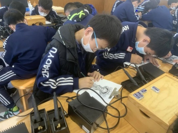 一处方桌,一块木板,一把烙铁,以画为题,无笔无墨,在温度与木板的碰撞中,一幅幅神奇的作品初见雏形,跃然而出,彰显着学生们的想象力和创造力。
