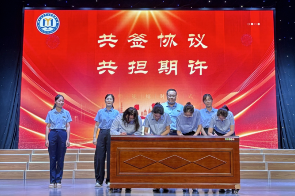 师徒双方在协议上郑重签名,交换文书。随后,在场的教师集体宣誓,誓言铿锵,回荡在礼堂。