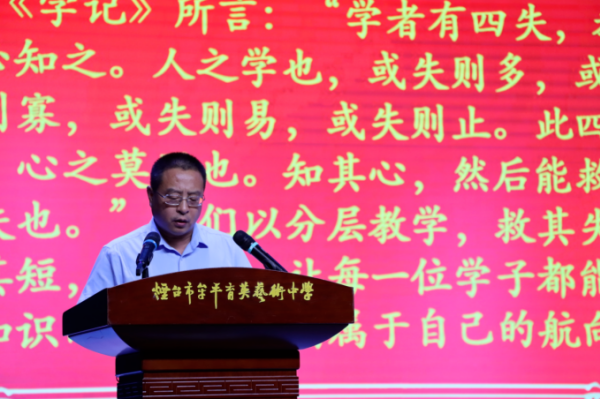 纪委书记谭富政在总结发言中指出,“青蓝工程”是学校加强教师队伍建设、深化“五育融合,特色凸显”办学理念的重要实践。他回顾了学校近年来推行“学为中心”课堂以及数学、外语分层教学的探索成果,强调这些改革既需要经验丰富的教师作为“引路灯”,也离不开青年教师注入的“新动能”。最后,谭书记寄语师父们“做经师更做人师”,徒弟们“勤学善思,争做发光者”,并鼓励师徒双方在教育路上“同研共进,共育时代新人”。