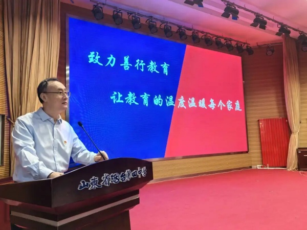 烟台四中党委书记于文斌同志致辞。于书记围绕“善行教育”这一核心,从党建、德育、课程、文化四大方面,介绍了四中新党委成立以来的办学举措与取得的成绩,并勾画出四中师生的样子。烟台四中旨在借助学科建设年推进学科组建设,依托教研联盟平台,与兄弟校共享经验,助力烟台教育发展,培育时代新人。