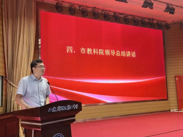 活动最后,烟台市教科院副院长翟雷厚总结发言,对市直教研联盟的联合教研工作既进行了宏观构建又提出了具体可操作的举措。他从“苏式”教育说起,强调在推进以学生为中心的课堂改革过程中,要做好三件事:一是锚定目标、系统规划,让教研从孤立真正走向互联,让活动成为常态;二是活化形式、跨校协同,校本教研要坚持引进来和走出去相结合,博采众长;三是共建共享、完善机制,注重成果的培育和成果转化。