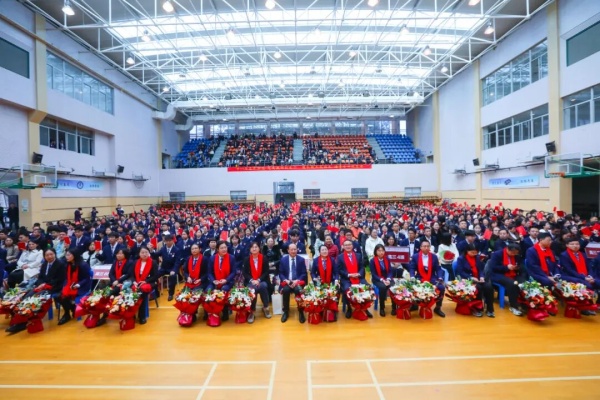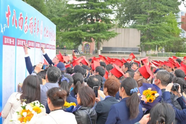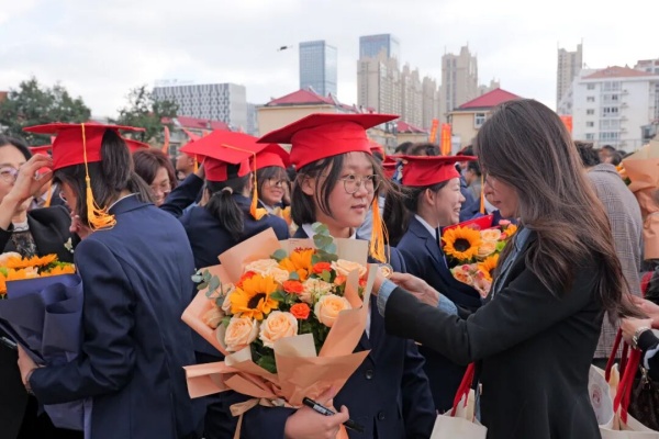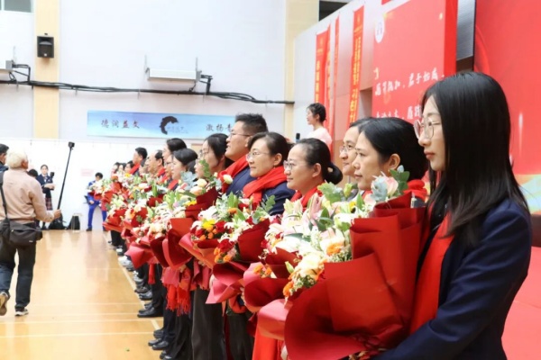 在温馨的乐曲中,学子们为辛勤付出的老师们献上鲜花并佩戴红围巾,感谢老师一路陪伴与教诲;老师们则将为学子佩戴上象征未来与梦想的大学校徽,完成一场温暖的期许与梦想的传递。