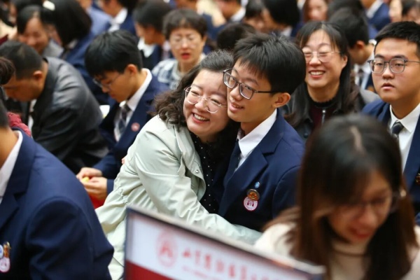 在庄重的氛围中,全体学子向父母行鞠躬感恩礼,感谢父母生身之重,养育之恩;感谢父母含辛茹苦,育你成人;感谢父母言传身教,立德明心。一个害羞又温暖的拥抱,表达埋藏心底羞于表达的爱。