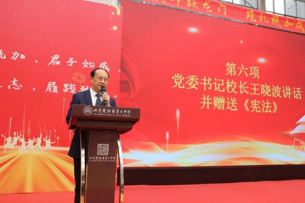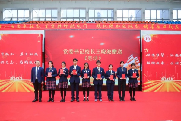 党委书记、校长王晓波从“见自己”“见天地”“见众生”三个维度寄语全体学子,回顾了十八岁不仅是年龄的增长,更是责任与担当的开始,并带领同学们学习宪法条文,向各班赠送《中华人民共和国宪法》读本,嘱托公民的责任与担当。