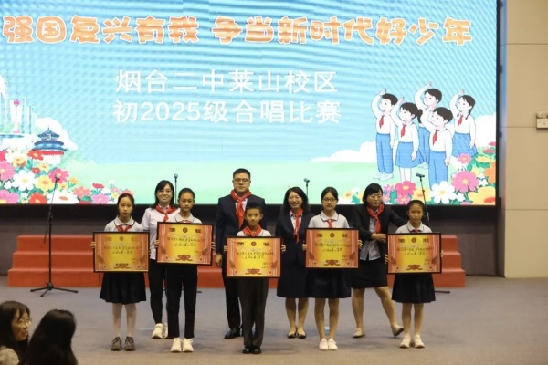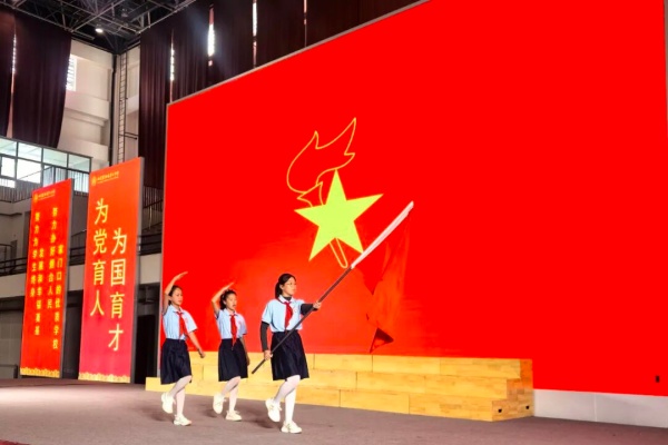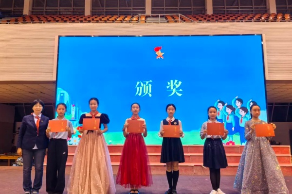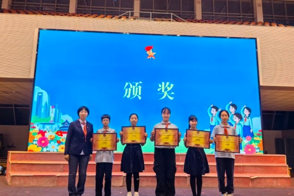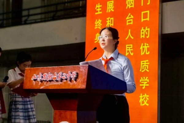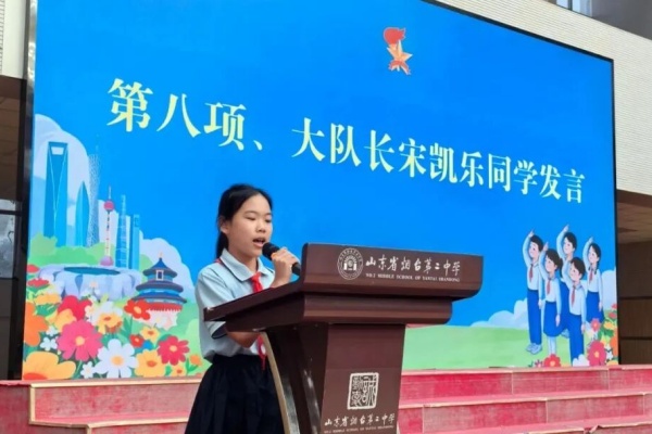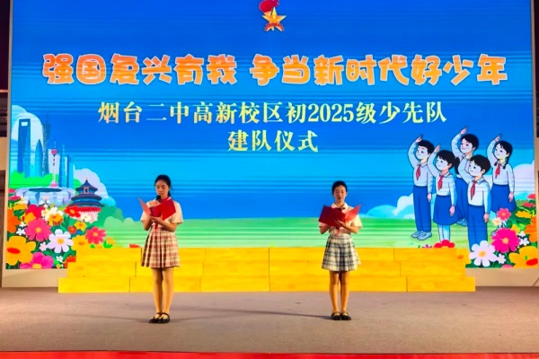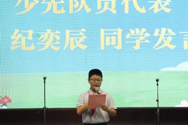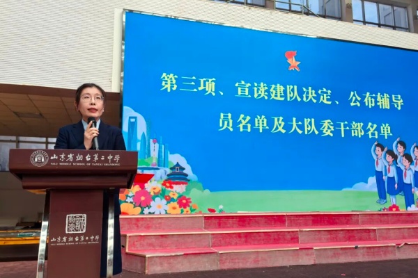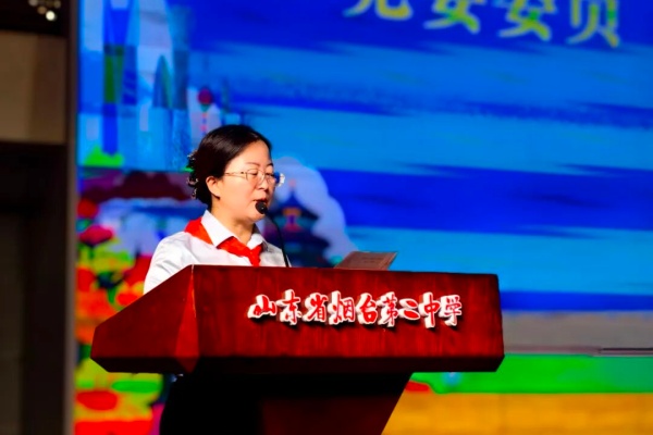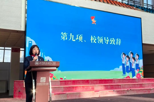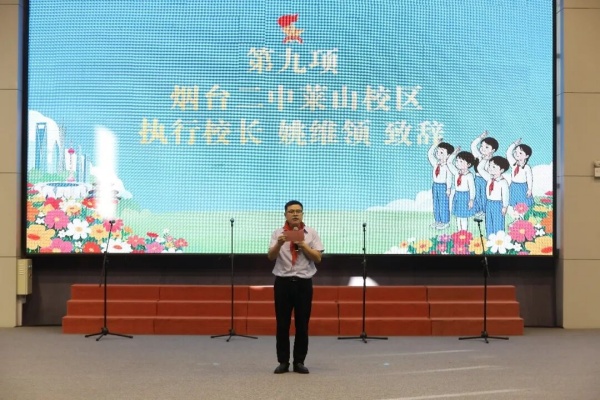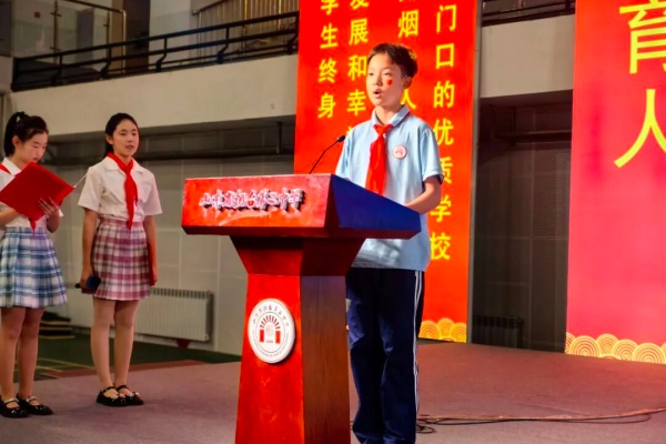 党委委员、纪委书记姚维领,党委委员曾庆静,芝罘校区初中教学工作负责人邵华进行致辞,他们勉励少先队员们传承红色基因,树立远大理想,争做担当民族复兴大任的时代新人。