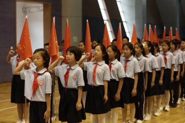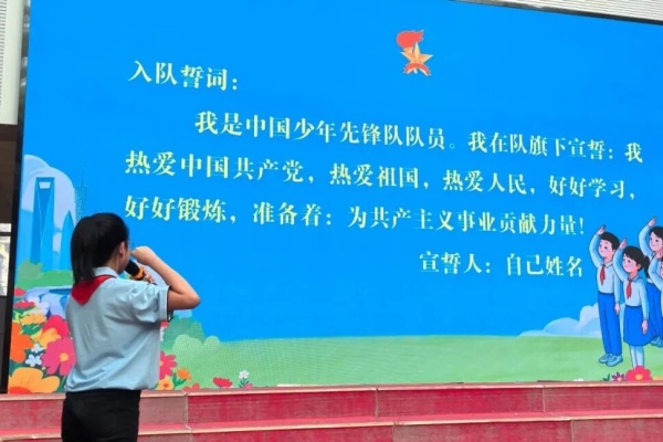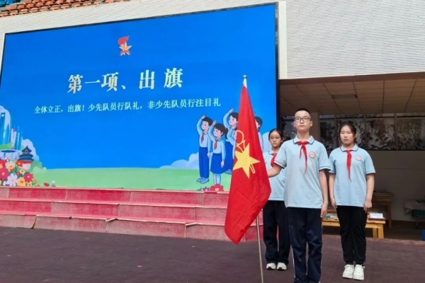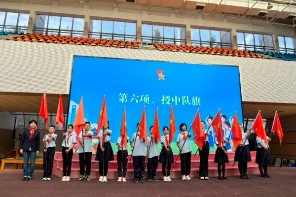 建队仪式在庄严的出旗曲中拉开帷幕。旗手与护旗手步伐铿锵,队旗飘扬,全体师生齐声高唱《中国少年先锋队队歌》,展现出新时代少先队员的昂扬风貌。
