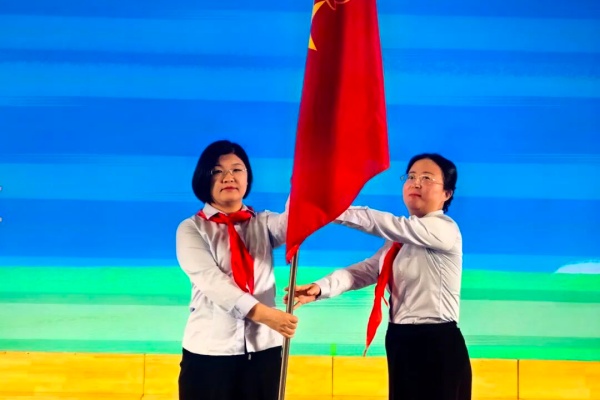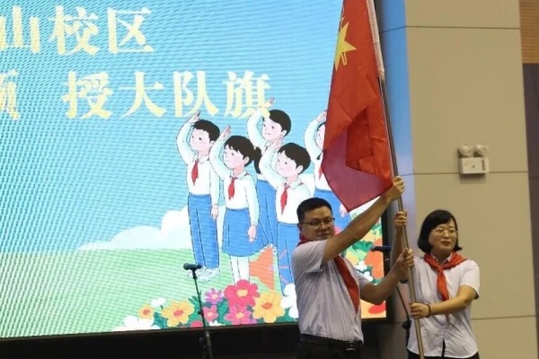 少先队员代表为与会领导和辅导员佩戴红领巾,传递敬意。校领导分别向大队辅导员授大队旗,芝罘校区大队辅导员鹿春艳、莱山校区大队辅导员滕玉、高新校区大队辅导员马青青分授中队旗。