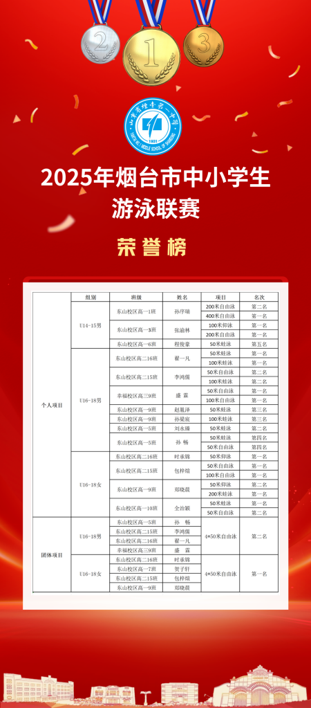 烟台一中作为山东省首批规范化学校、市级游泳项目特色校,始终秉承“科学素养、人文情怀、扬长发展、社会责任”的育人目标,坚持“五育并举”,着力构建高素质游泳梯队。此次联赛,全面彰显了学子卓越的运动技能和良好的精神风貌,集中展示了学校扎实推进体教融合的丰硕成果。