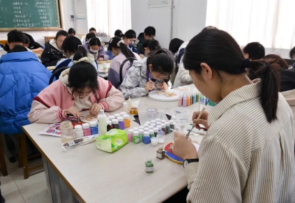 在全面加强美育工作的政策指引下,烟台一中始终秉持“以文化人、以美育人”的理念,先后成立剪纸社、掐丝珐琅社、书法社、绘画社等传统文化类社团,构建起“一纸一剪、一铜一釉、一撇一捺、一笔一画”交相辉映的美育格局。