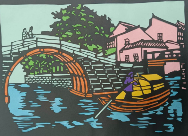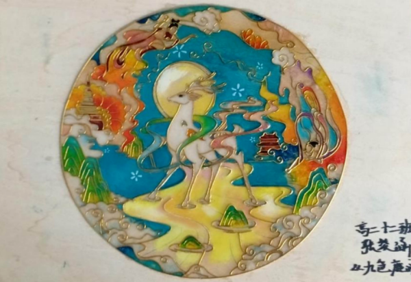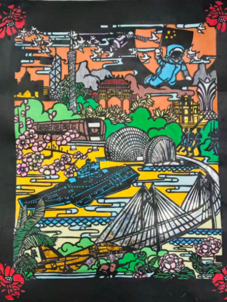 剪纸社作品《盛世欢歌》,将新时代的自信与从容凝铸于彩纸之上;掐丝珐琅社创作的《脸谱》,金丝缠绕、釉彩交融,梦幻色调中萦绕果香。书法社坚持“日课百字,磨墨三升”,以笔墨与经典对话;绘画社融合传统水墨与数字版绘,让国潮艺术插上AI之翼。学生在“做中学、创中悟”,以指尖温度唤醒千年技艺;于“墨中舞、绘中歌”,用腕底春风晕染万里河山。每一件作品都凝结着师生的心血,展现出非凡的专注力与创造力。