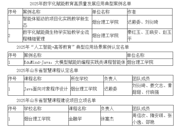 近日,烟台理工学院在教育教学数字化转型与人工智能赋能领域连获多项标志性成果,《Java面向对象程序设计》《金融学》两门课程分别获得省级智慧课程认定与立项,《智能体驱动的项目化实践教学新生态》《数字化赋能微生物学实验教学全流程精细管理》等2项案例成功入选山东省数字化赋能教育高质量发展应用典型案例,《“EduMind-Java:大模型赋能的编程实践类课程智能体》案例被认定为山东省“人工智能+高等教育”典型应用场景,实现省级“案例+场景+课程”大满贯。这一系列省级成果的集中涌现,标志着烟台理工学院在推进教育教学数字化转型、深化人工智能与教育教学深度融合方面取得了阶段性显著成效,获批省级典型案例成果数量位居全省同类高校首位。