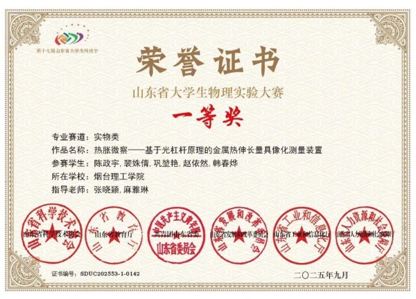 近日,山东省第十七届大学生科技节——山东省大学生物理实验大赛在烟台大学圆满落幕,信息工程学院获省级一等奖1项、省级三等奖2项。