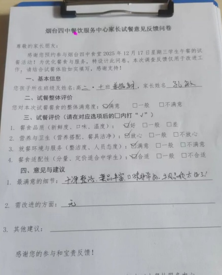 用餐结束后,孔女士认真填写了《烟台四中餐饮服务中心家长试餐意见反馈问卷》。她对学校食堂整洁有序的环境、规范严谨的管理流程、餐品合理的价格与口味给予了高度评价,也对学校主动开放欢迎监督的态度表示赞赏。