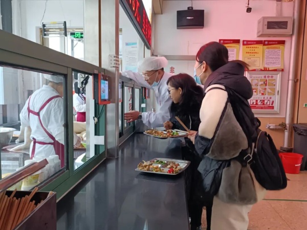参观交流结束后,孔女士在一楼售餐窗口,按照学生餐的统一售价,自主选购了几样荤素搭配的菜肴和主食,与班主任侯菲老师一同共进午餐。
