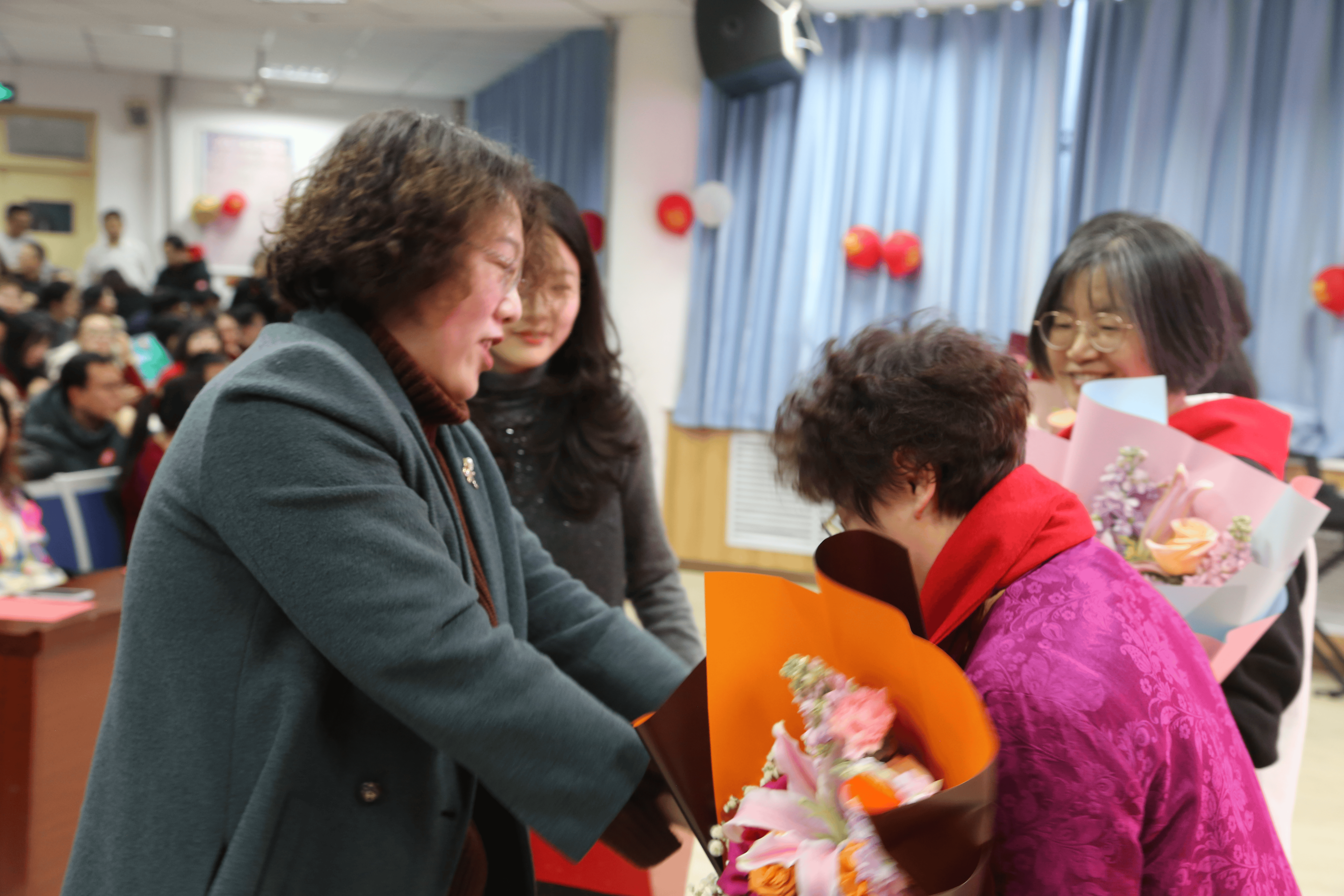 随后,现场举行了温情的致敬环节。青年教师代表手捧鲜花,向五位前辈致以诚挚的问候,象征着教育薪火的代代相传。曲晓媛校长逐一为荣退教师颁发荣退纪念证书,并为他们披上寓意温暖与吉祥的红色围巾。一份证书,承载着学校的无限感激;一条围巾,寄托着全体同仁的美好祝愿。