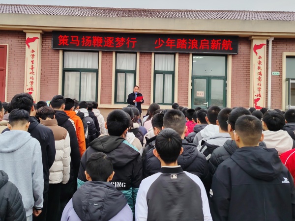 新学期伊始,姜格庄街道初级中学师生齐聚操场,开展“开学第一课”主题活动。校长勉励全体同学收心归位、勤学笃行,严守校规校纪,树立远大理想,以昂扬向上的精神面貌迎接新挑战。各班召开主题班会,引导学生明确目标、端正态度、规范行为,以崭新姿态投入学习生活,不负韶华、逐梦前行。