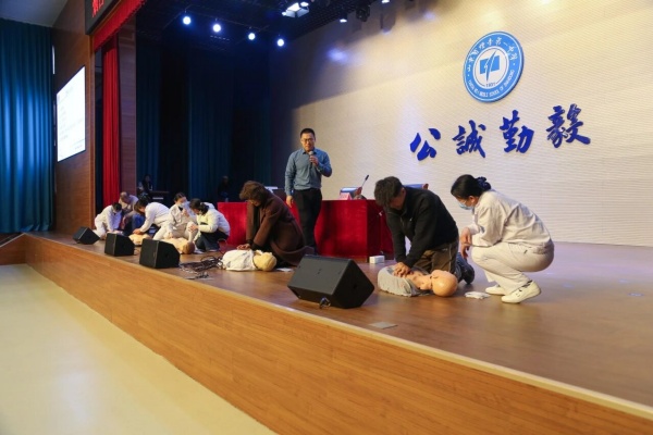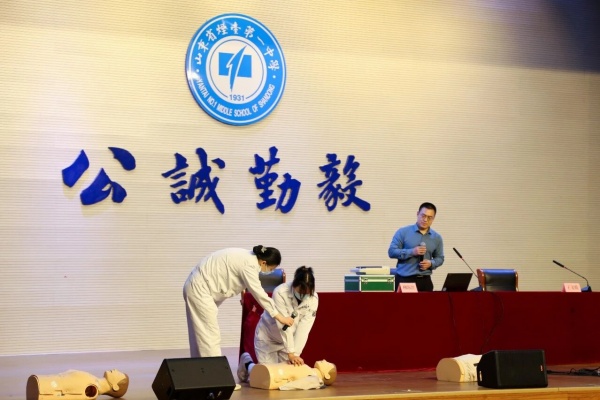 作为全国急救教育试点学校,此次大会邀请了烟台山医院急诊科柳海滨主任到校开展应急处置和急救技能培训。