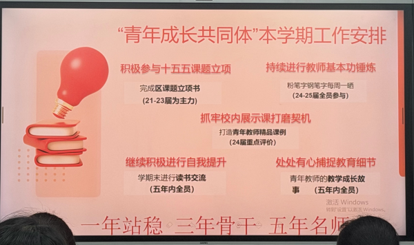 会议伊始,辛主任对上学期青年共同体完成的各项工作进行全面总结,分享了学校青年教师培养工程的闭环管理思路。教研室根据青年教师的成长节奏,在本学期重点围绕青蓝工程、基本功锤炼、课题研究三大模块提出更高要求。