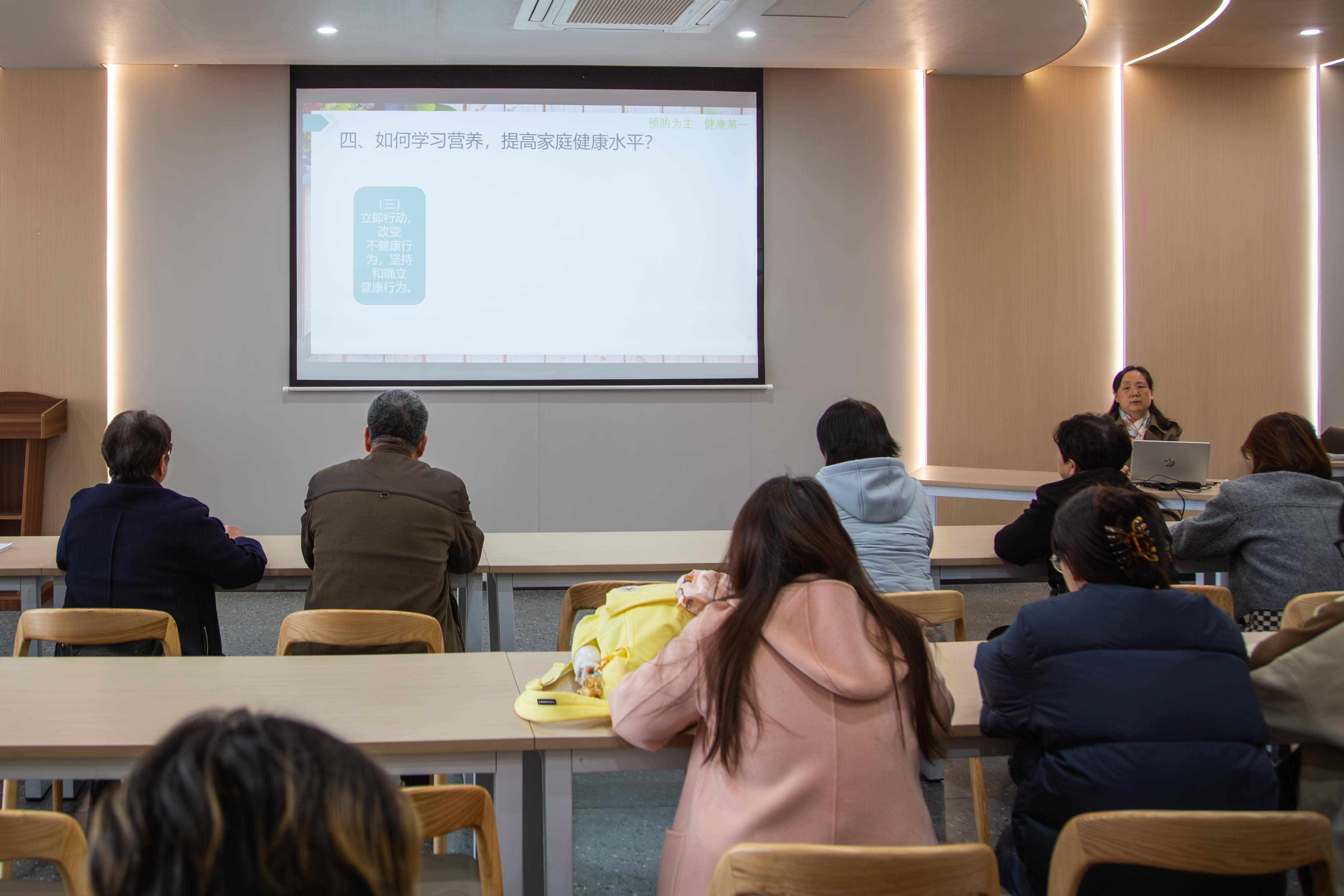 学院"五老"志愿者成员、退休党员,原旅行与康养管理系党支部书记李红,依托自身深耕康养领域多年的专业积淀与健康知识储备,从"营养三问"开始,以"平衡膳食八准则"结束,以通俗易懂的语言、贴近生活的案例,生动详细活泼有趣的进行讲解,为社区居民带来一场兼具专业性与实用性的健康讲座。