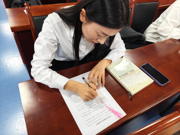 仪式现场,全体读书共同体成员郑重签订读书承诺书,以坚定承诺践行阅读初心。名师代表赵秀丽老师、青年教师代表张雨珊老师依次发言,传递名师引领、青年奋进的成长力量。学校相关负责人为教师代表赠书、赠送定制读书书签,全体教师在书签上写下读书目标与成长寄语,在书香传递中凝聚共读共识。在主任周进带领下,全体成员庄严宣誓,以铿锵誓言表达静心阅读、深耕教学、共促成长的坚定决心。