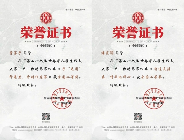 笔墨言志,文字传情。世界华人学生作文大赛是海内外华人学子交流思想、展现文采的重要平台,影响力广泛、权威性强。烟台四中学子以真挚的情感、独特的视角、流畅的表达脱颖而出,既是个人努力的成果,更是学校坚持素养导向、深耕语文教育、重视作文教学的生动体现。