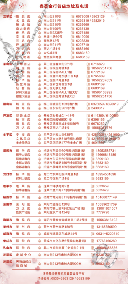 鑫荟金行专营黄金、铂金、钻石、彩宝、18K彩金、翡翠、珍珠、银饰等贵重饰品!始终把“契约精神”和“工匠精神”作为核心价值观,以复兴民族品牌和重振中华老字号为使命。秉承“高工高料、精细服务”的经营理念,多次被评为“山东省价格诚信单位”“山东省消费者满意单位”“烟台市希望青少年基金会理事单位”“中华珠宝名店”等荣誉称号。是为数不多通过ISO9001国际质量管理体系认证的黄金珠宝零售企业。