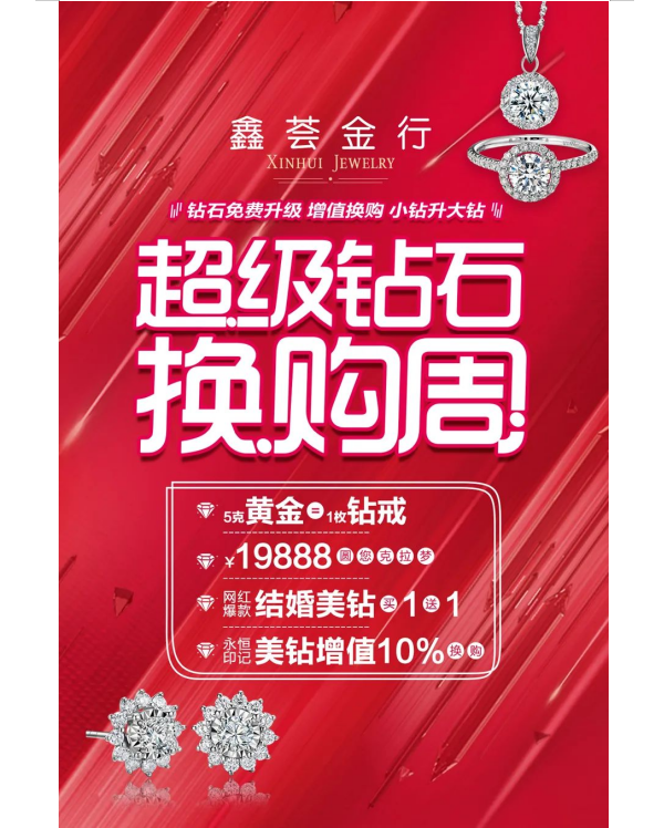 几年前买的钻石太小、款式老旧,想换漂亮的新款,再买一枚又超预算,鑫荟金行超级钻石换购周为你而来,标价等值升级!小钻换大钻,越换越增值!千枚美钻闪耀上新,款式新颖又时尚,为您旧钻换新颜,升级换大钻!