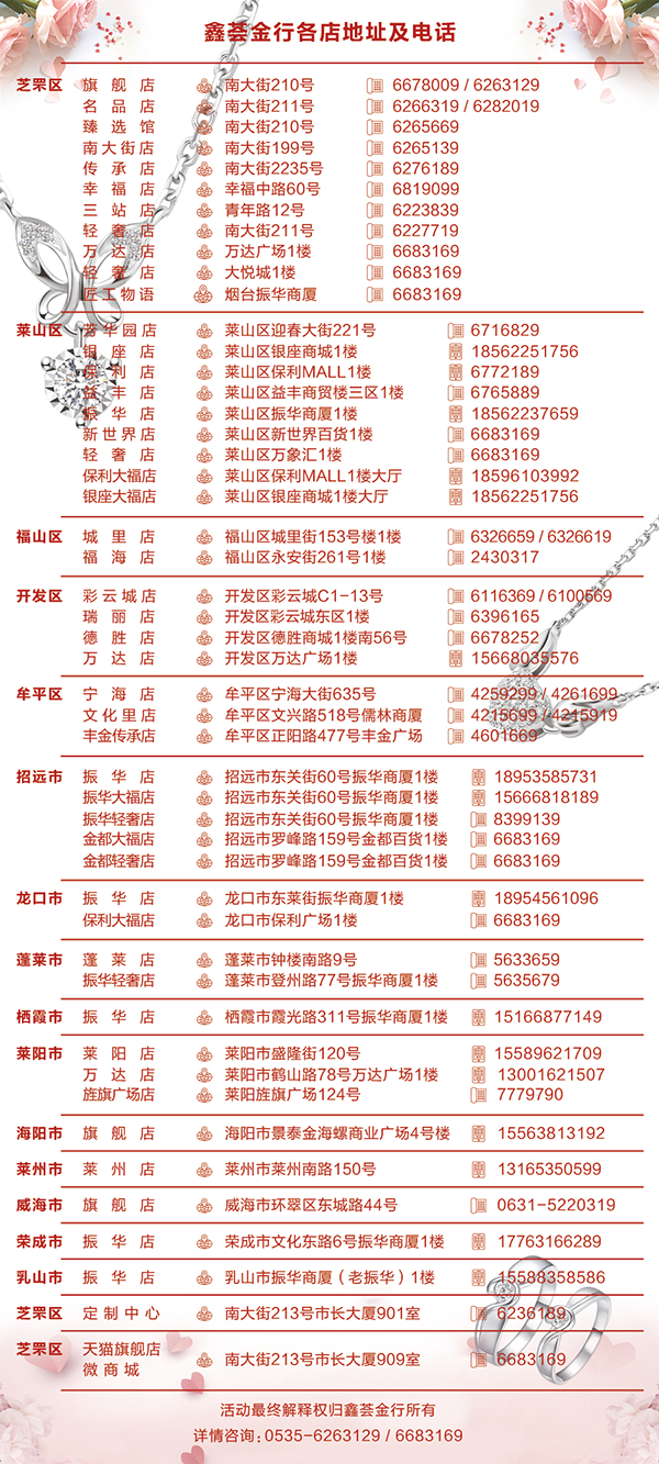 鑫荟金行专营黄金、铂金、钻石、彩宝、18K彩金、翡翠、珍珠、银饰等贵重饰品!始终把“契约精神”和“工匠精神”作为核心价值观,以复兴民族品牌和重振中华老字号为使命,秉承“高工高料、精细服务”的经营理念,多次获得“山东省价格诚信单位”“山东省消费者满意单位” “烟台市希望青少年基金会理事单位”“中华珠宝名店”等荣誉称号,是为数不多的通过ISO9001国际质量管理体系认证的黄金珠宝零售企业。