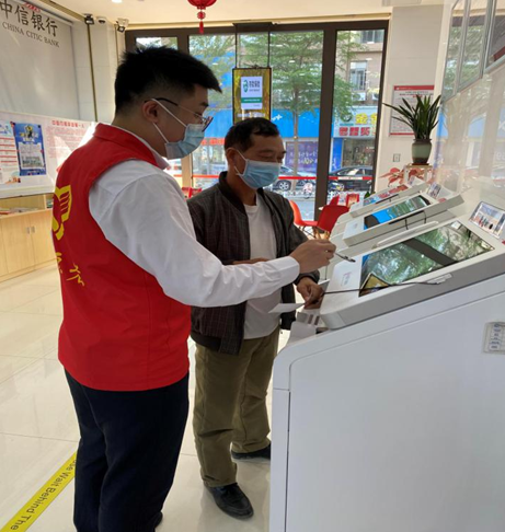 中信银行广东茂名支行柜员指导彭大爷使用智慧柜台开卡。