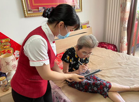 中信银行天津梅江支行员工为卧病在床的90岁老阿姨开立发放重阳节补贴专用卡。