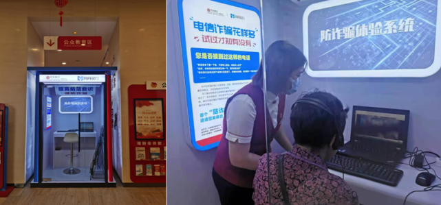 中信银行杭州分行在网点公众教育区内设立了“高科技范儿”的防诈模拟体验点,由柜员引导老年客户沉浸式体验电信诈骗,教老年客户识诈反诈。