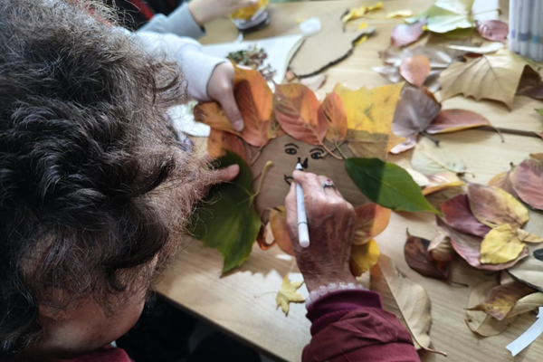 文艺表演结束后,志愿者与老人们共同开启了趣味十足的落叶手工创作环节。金黄的银杏叶、火红的枫叶在大家手中翻飞,经过裁剪、粘贴、点缀,一个个精致的祈福树、一顶顶精美的皇冠、一幅幅生动的画卷、一个个可爱的小动物应运而生。看着爷爷奶奶们带着一顶顶皇冠,手拿着祈福树和花束,捧着自己的作品像孩子般“炫耀”,纯粹的快乐极具感染力,让志愿者跟老人都流露出了发自内心的笑容。