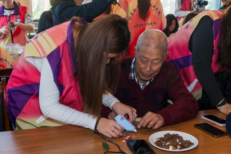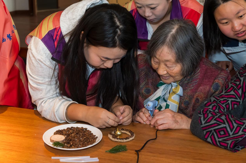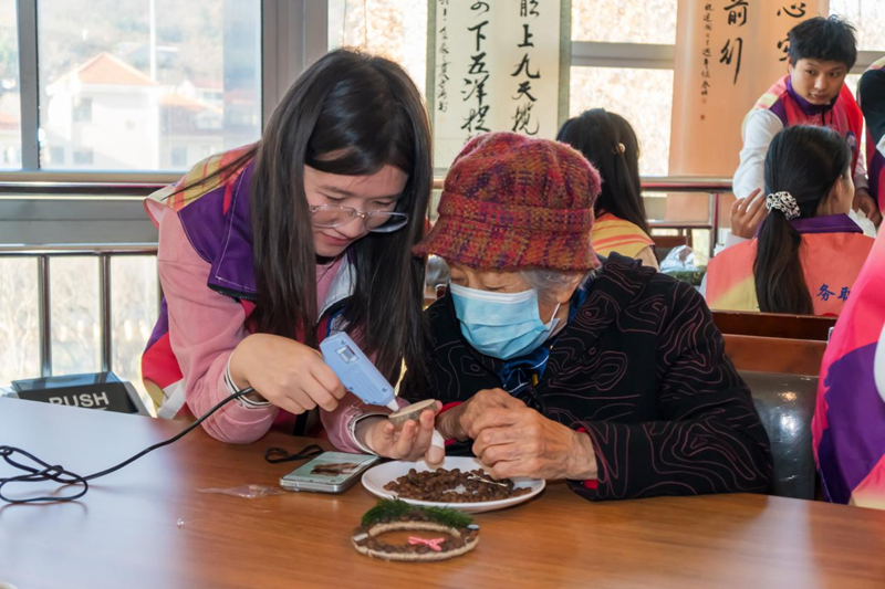 在“青韵舒压养心性,安然自在享宁静”主题环节,志愿者们创新实践模式,活动核心是咖啡豆DIY手工作品创作。这并非简单的手工,而是精心设计的“非语言沟通媒介”。学生们引导老人挑选豆粒、构思图案、协作粘贴,在共同的专注与创作中,焦虑与疏离悄然消融,代之以宁静的陪伴与创造的喜悦。
