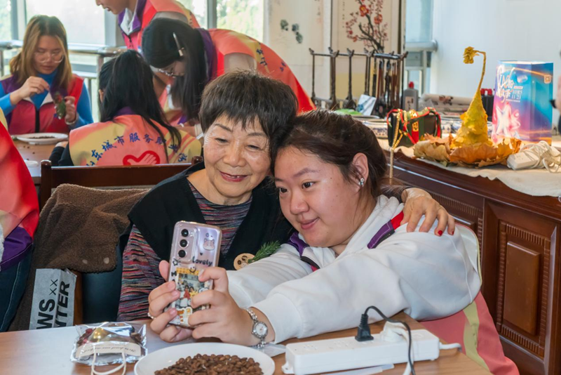 随后进行的“紫韵传情感恩心,岁月沉香爱意凝”主题环节,则将活动推向情感的高潮。师生们与老人一同观看了精心制作的高光“食”刻回顾视频。视频浓缩了过去三周里,从营养知识传递到共同制作食物的无数温馨瞬间。更引人注目的是,项目创新运用AI技术,生成并展示了“代际拥抱留念”影像。科技的力量,将那些可能因羞涩未能充分表达的亲密接触,转化为永恒温暖的数字画面,引发了现场阵阵感动与惊叹。
