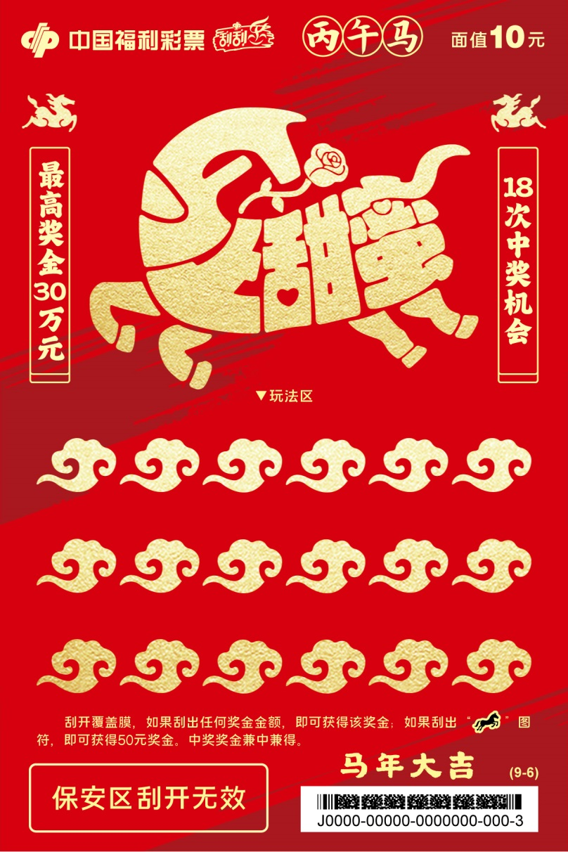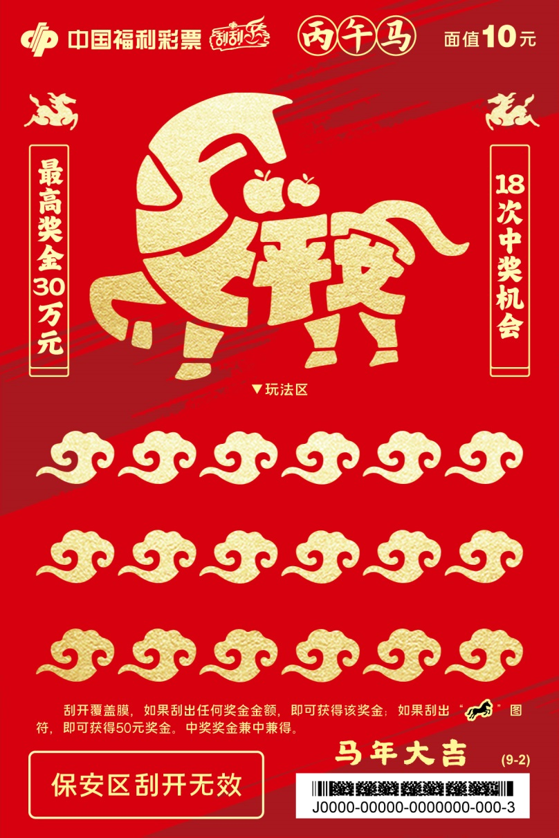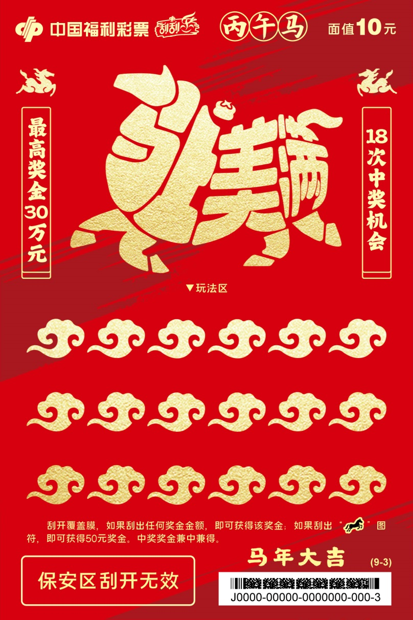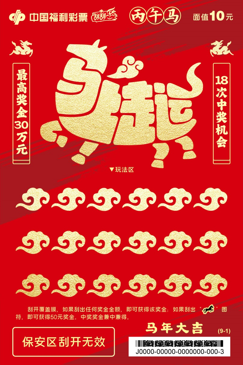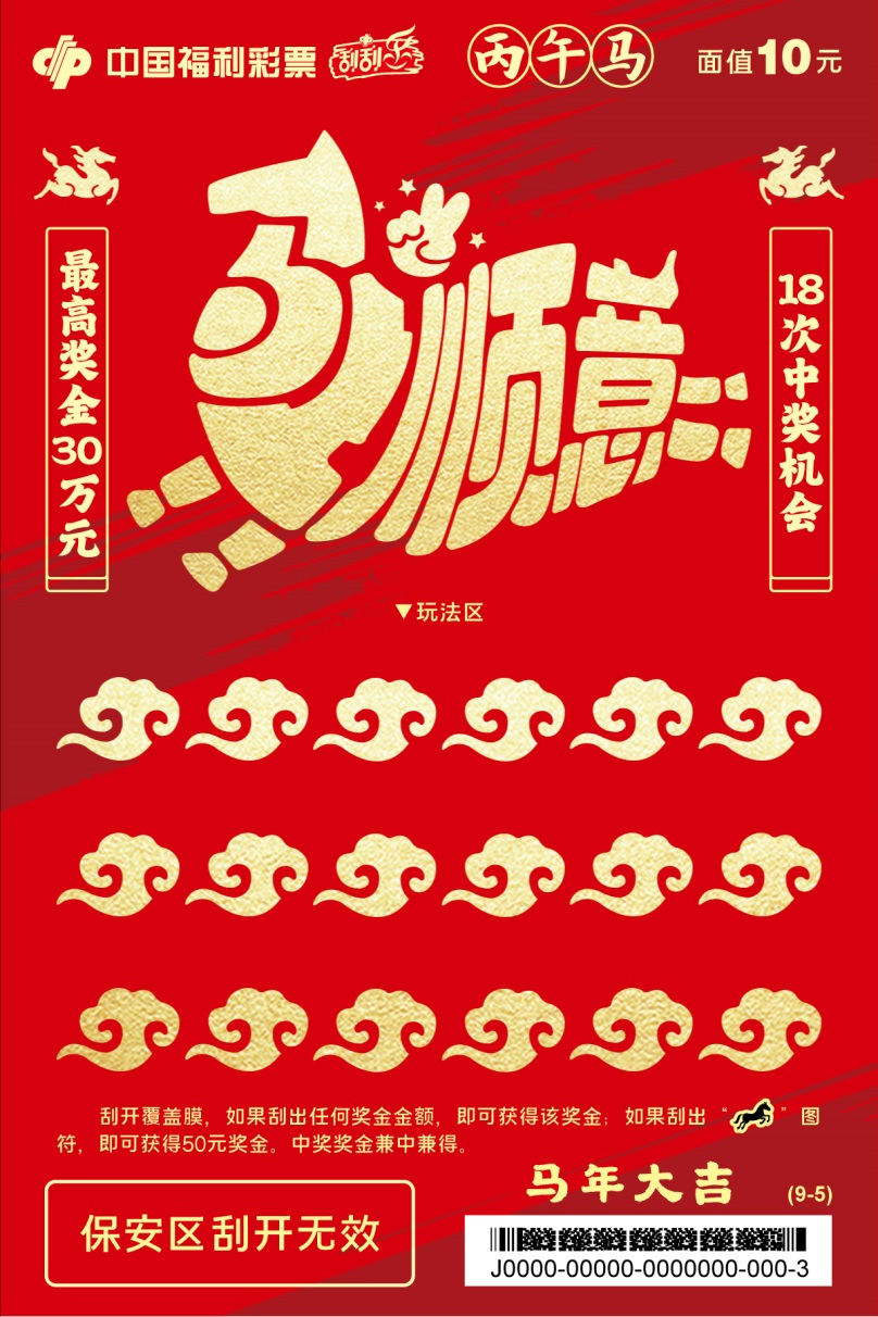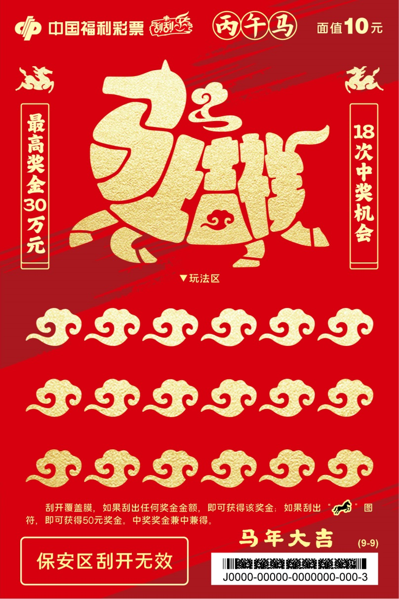 九张票面分别以马上走运、马上平安、马上美满、马上开心、马上顺意、马上甜蜜、马上成功、马上有福、马上吉祥为主题,烘托生肖贺岁的吉祥氛围,承载满满马年祝福。刮开覆盖膜,如果刮出任何奖金金额,即可获得该奖金;如果刮出“骏马”图符,即可获得50元奖金。中奖奖金兼中兼得。最高奖金30万元,共18次中奖机会。