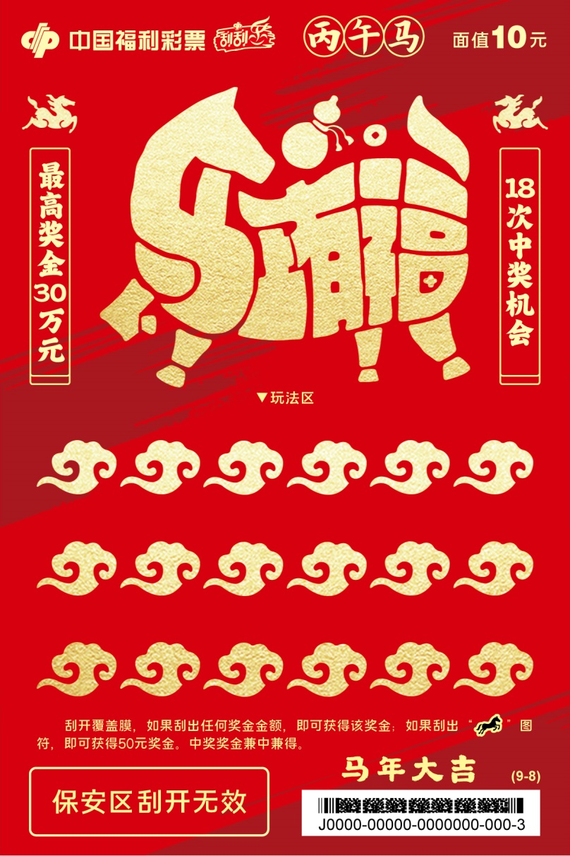 四张票面色彩明快,融入非遗剪纸技艺,镂空线条勾勒骏马奔腾之姿。刮开覆盖膜,如果刮出任何奖金金额,即可获得该奖金;如果刮出“骏马”图符,即可获得100元奖金。中奖奖金兼中兼得。最高奖金80万元,共25次中奖机会。