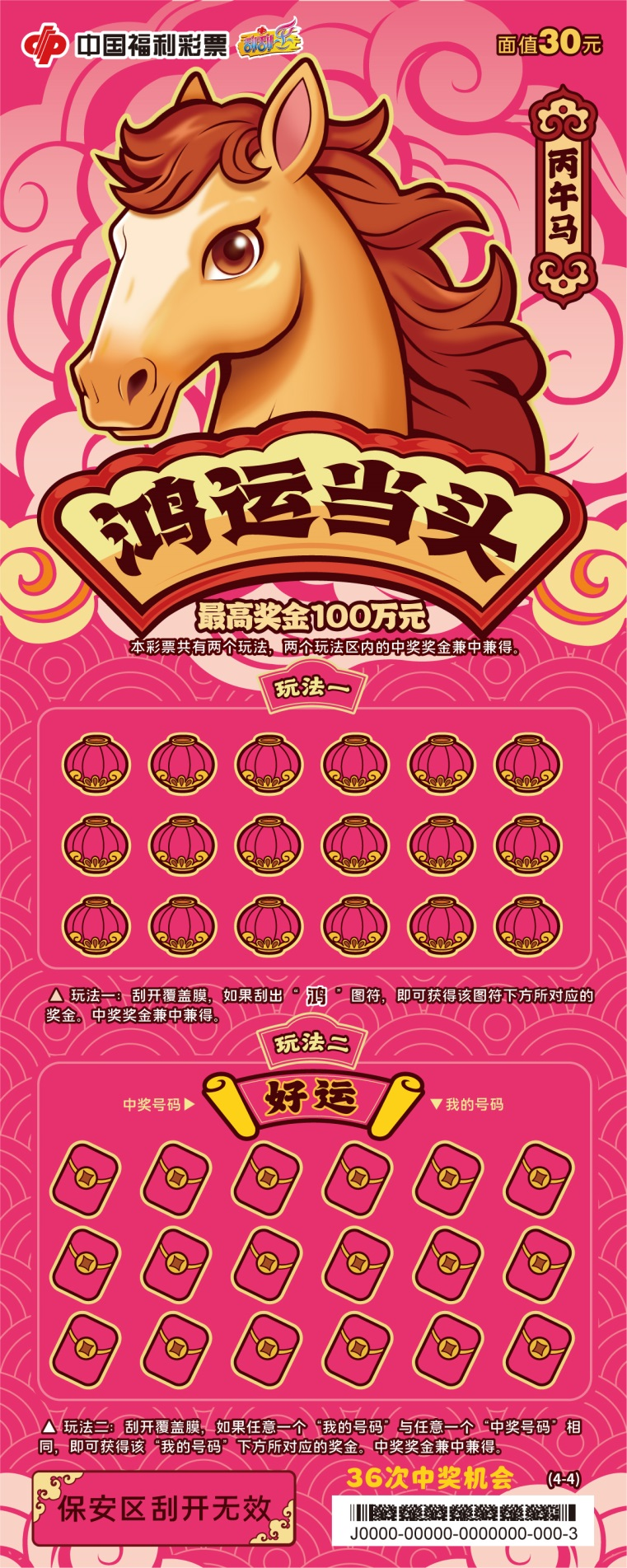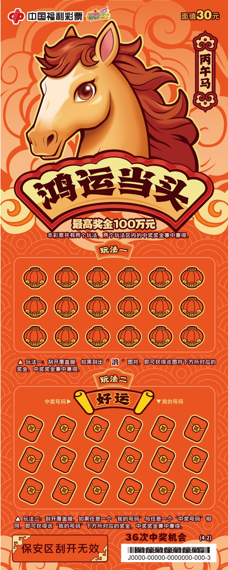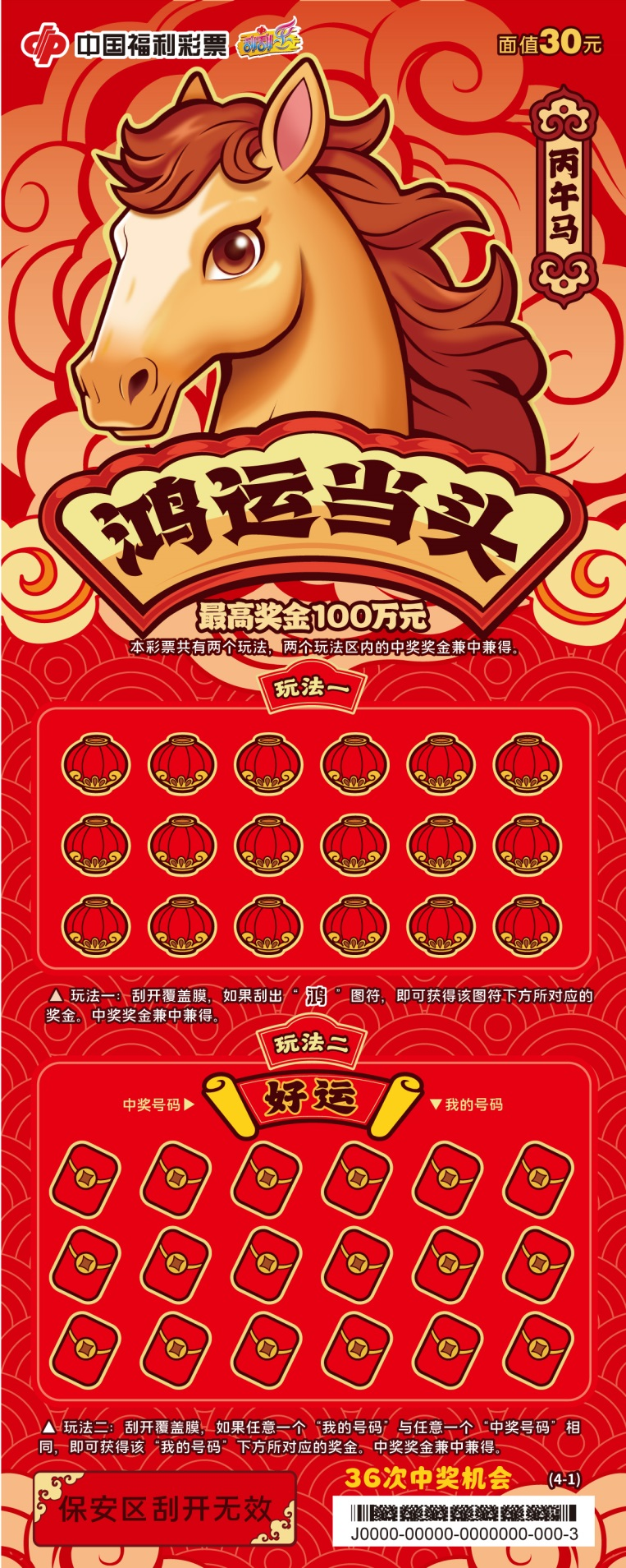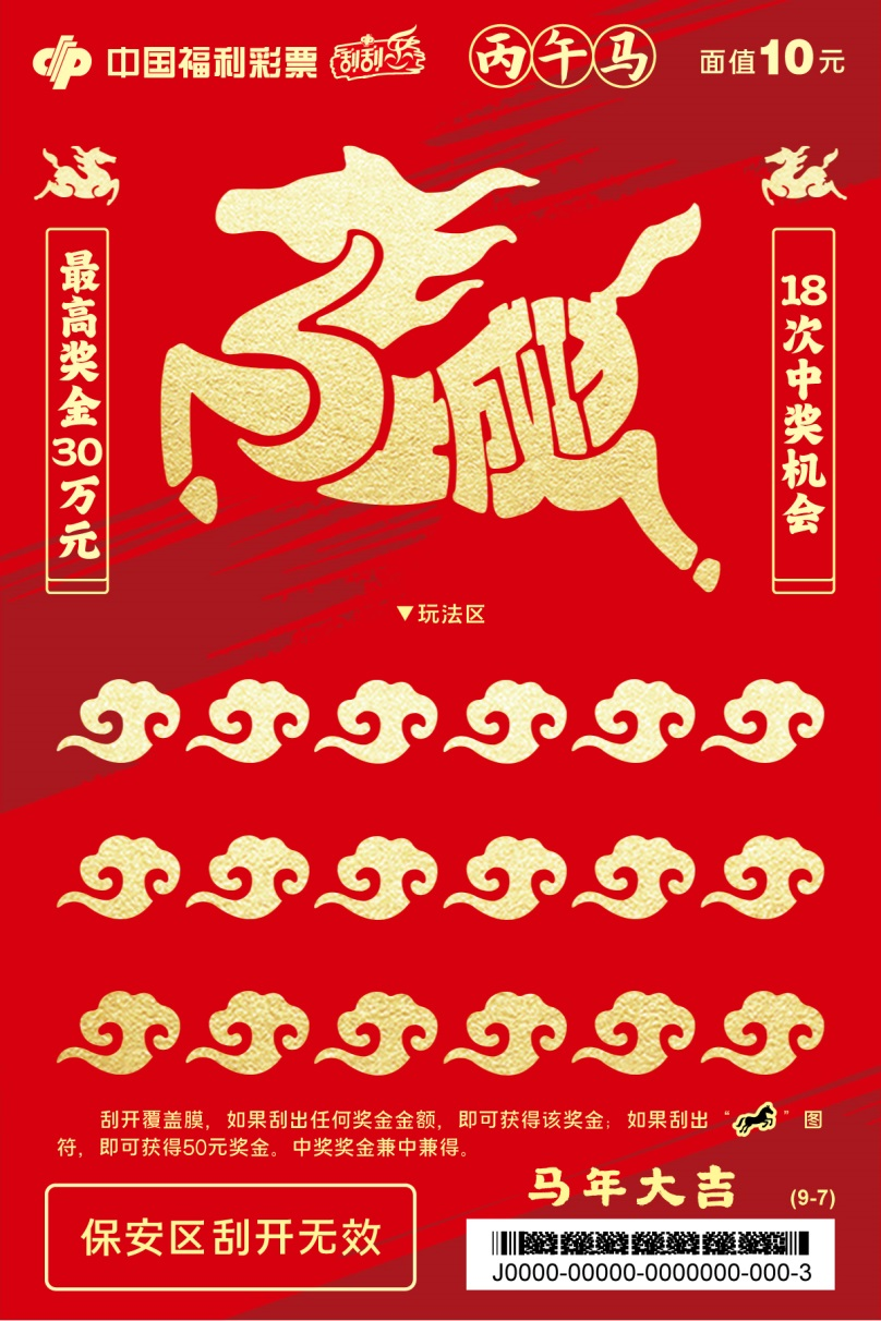 票面以红金为主色调,骏马奔驰画面气势恢宏,象征以昂扬姿态迎接新年的勃勃生机。最高奖金100万元,共50次中奖机会。