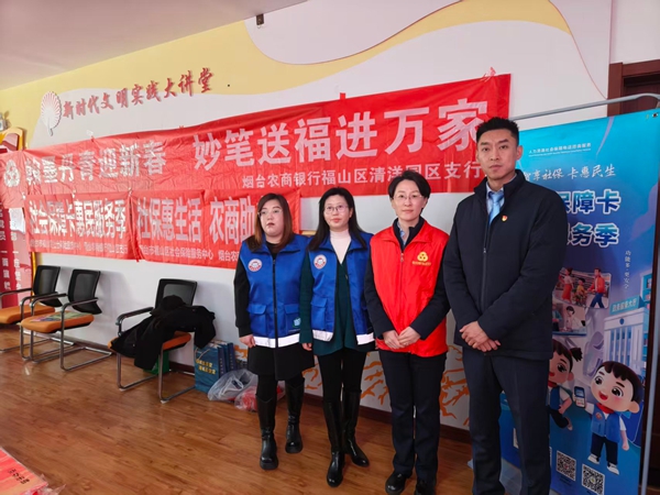 胶东在线1月23日讯(通讯员 董子平)临近春节,年味渐浓。为答谢广大客户的支持,在厅堂营造祥和喜庆的节日气氛,近日,烟台农商银行福山区清洋支行党支部、业务运营部联合福山区社保中心党支部、南苑街社区党支部共同开展“翰墨丹青迎新春飘香 妙笔送福进万家”写福字送福气活动,邀请了烟台市书法协会艺术家现场为社区居民创作春联和福字。