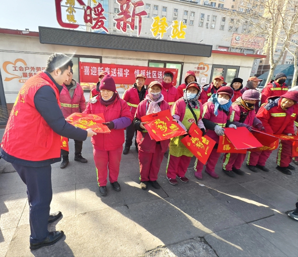 活动现场暖意融融,该行党员先锋队带着提前准备好的福字、新春慰问品,将一份份心意逐一送到每一位清洁工人手中。大红的福字寓意吉祥,实用的慰问品饱含温情,小小的物件不仅承载着浓浓的新春喜庆,更拉近了银行、社区与一线劳动者之间的距离,为凛冽寒冬里依旧坚守岗位的他们,增添了几分融融暖意。