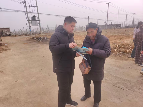 薄雾笼罩的乡间小路上,栖霞农行的员工正拿着宣传折页,和一位老乡面对面唠起了“防诈家常”。