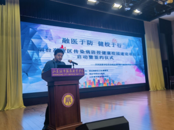 胶东在线10月10日讯(通讯员 郭瑞 刘涛)9月24日,烟台市疾病预防控制中心联合烟台市高新区卫生健康局、烟台市烟台山医院、山东城市服务职业学院举行“融医于防•健校于行”建设合作项目签约仪式。签约仪式上,各方代表围绕“融医于防?健校于行”建设合作项目的规划和发展方向进行了深入探讨,并正式签署合作协议。烟台市疾控中心和烟台山医院分别从学校常见传染病监测与防控及校园传染病防控实践与健康管理等方面进行健康宣教,进一步提升学生群体的防病意识和健康素养。