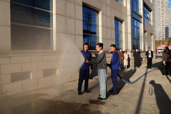 理论培训结束后,进入实操演练环节。在消防专家的指导下,参训人员现场观摩了消防车及各类消防器材,了解其性能、使用场景,在专业消防员的监护下亲身感受高压水枪的使用方法与灭火效果。此外,活动还组织了火灾逃生疏散演练和灭火器实操训练。