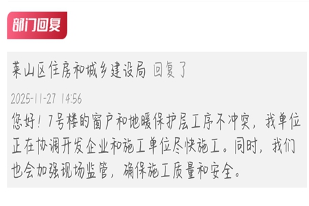 莱山区住房和城乡建设局回复:您好!据施工单位反馈,当前气温已不满足地暖施工条件,为避免产生质量问题,施工单位计划于明年气温回暖后重新整备已施工完部分并进行后续施工。