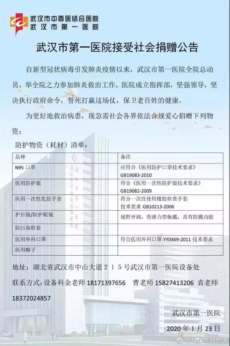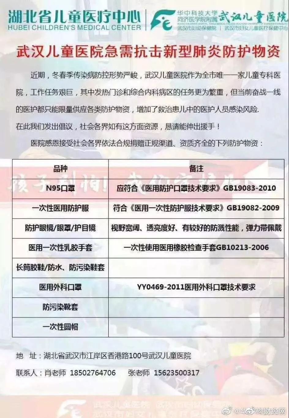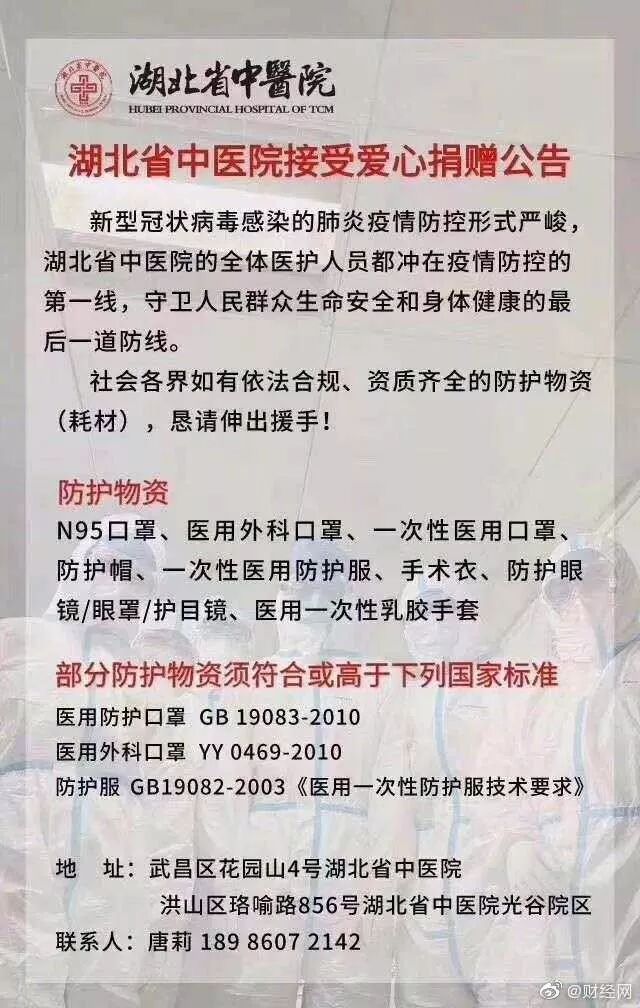 自新型冠状病毒引发的肺炎疫情出现以来,武汉市第三医院工作任务艰巨,但目前奋战- 线的医护的防疫用品告急,无法保证-线医护的安全,增加了一线医护人员的感染风险。在此我们发出倡议,社会各界人士如有这方面资源,恳请能伸出援手!医院感恩接受社会各界依法合规捐赠正规渠道、资质齐全的下列防护物资: