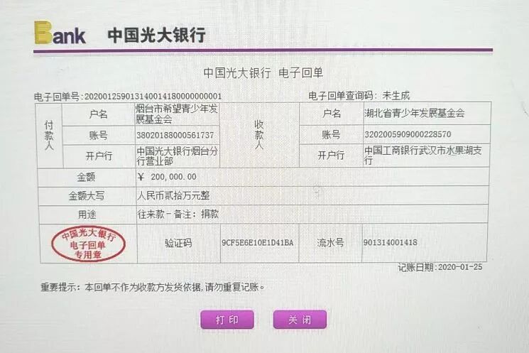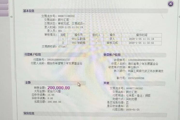 1月25日,面对来势汹汹的疫情,烟台市希望青少年发展基金会向湖北省青少年发展基金会捐助人民币20万元,由武汉市青基会根据疫情需求使用,为抗击新型冠状病毒感染的肺炎尽一份力。