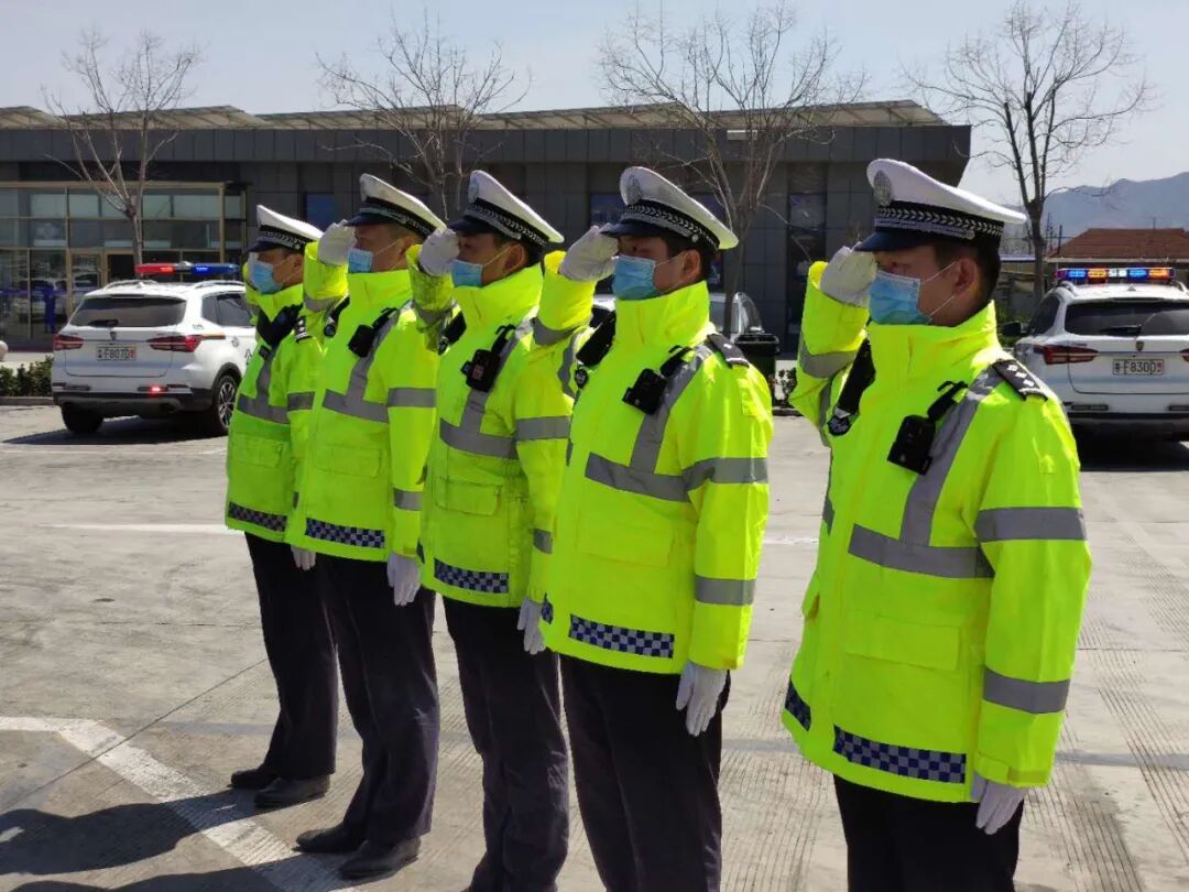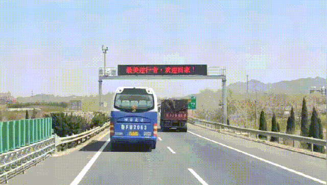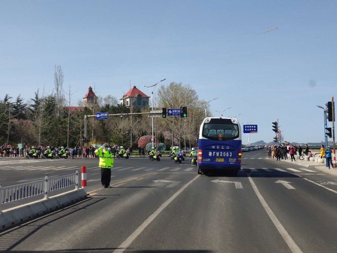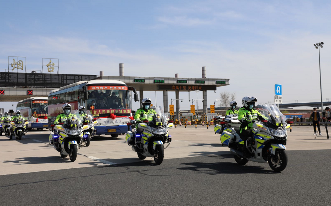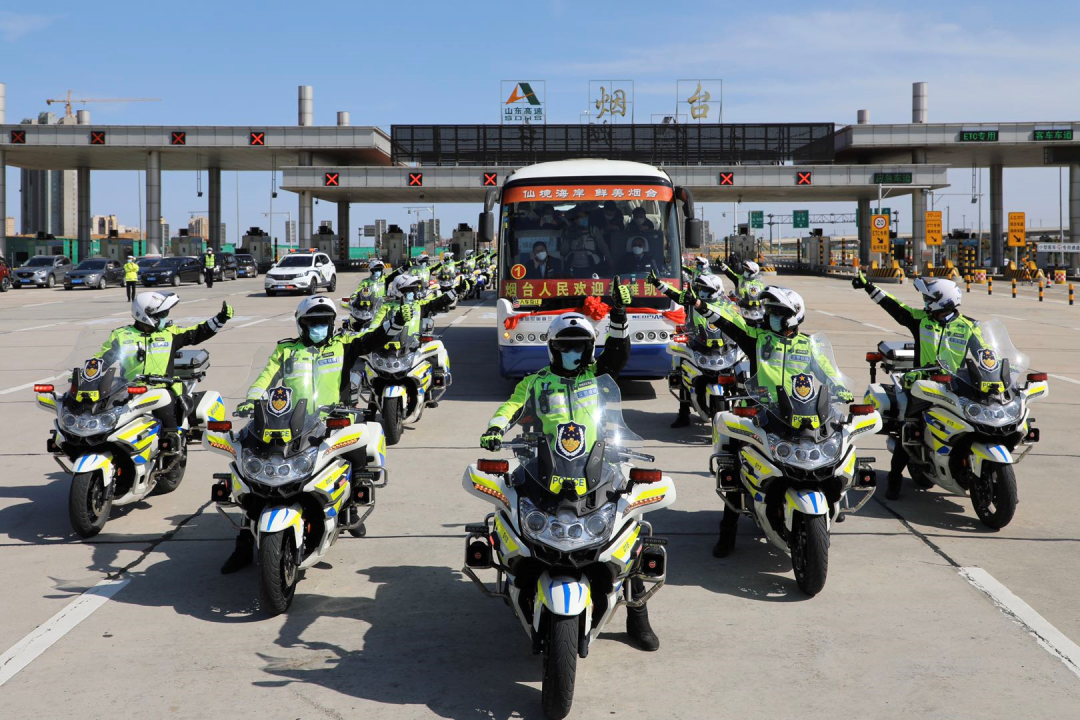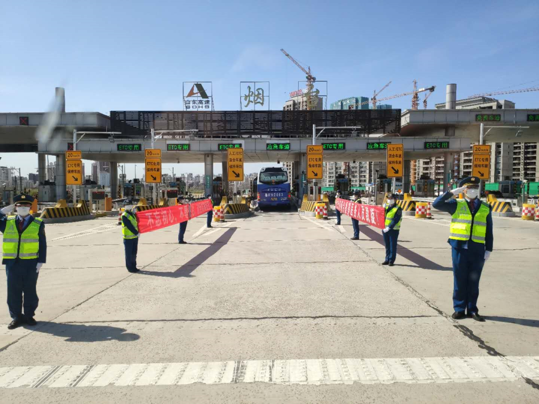 车队到达烟台高速口,收费站工作人员列队欢迎