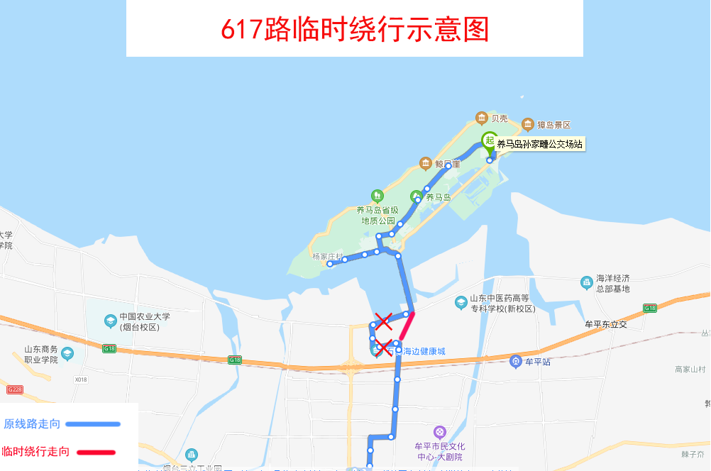 由养马岛孙家疃场站发车,沿原绕行方案运行至滨海东路与东关路交叉口直行,沿东关路行至东关路与烟霞大街交叉口直行恢复原线路。