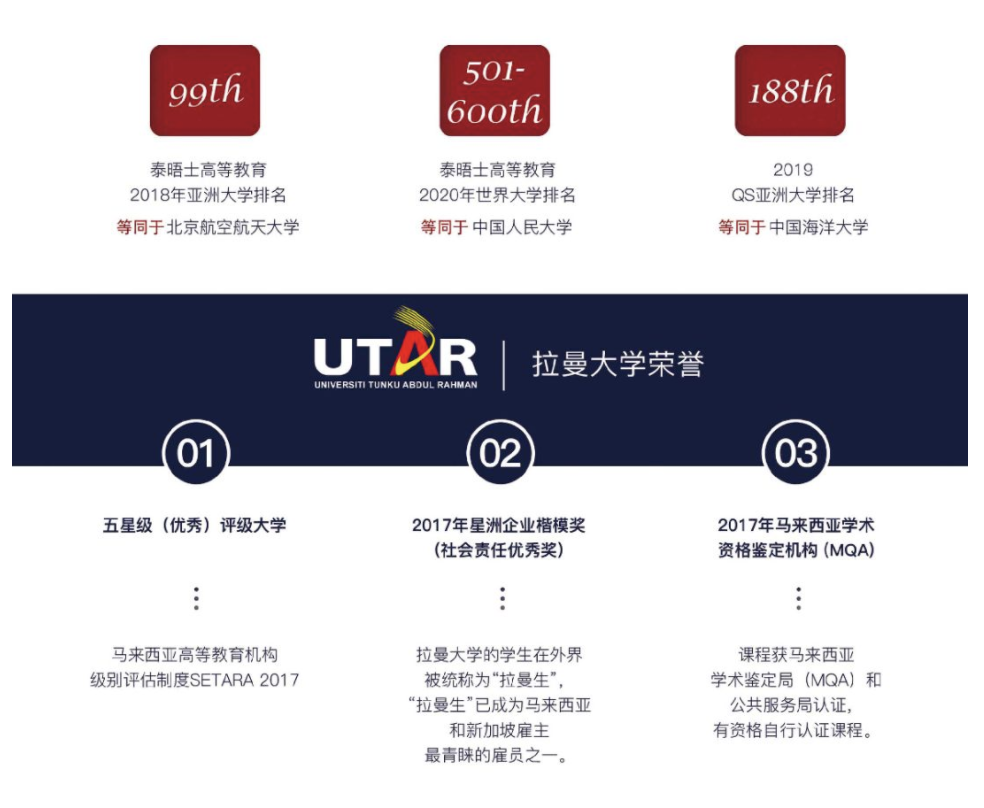 马来西亚拉曼大学 (Universiti Tunku Abdul Rahman; 简称:优大 / UTAR)是马来西亚公认首屈一指的名校。在权威的泰晤士高等教育排名中位列亚洲大学排名第99位(2018),居全马第二,相当于国内的重点985、211,与中国人民大学、武汉大学、厦门大学等高校排名相当。